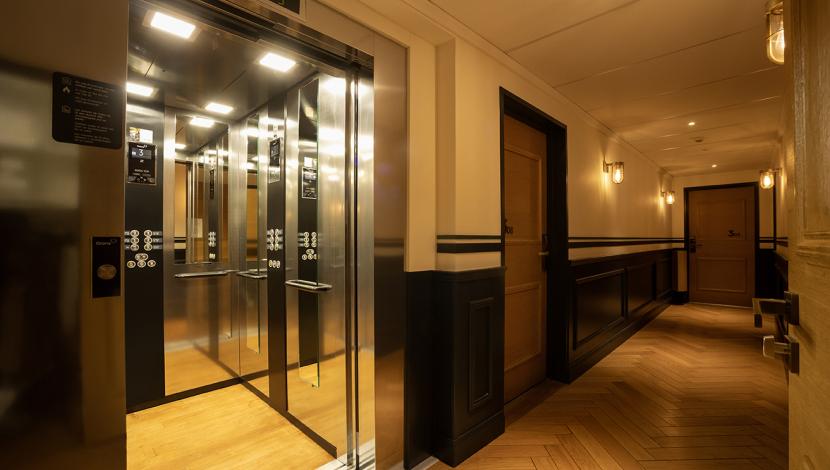 Pour faciliter la mobilité entre les différents étages, l’hôtel intègre un ascenseur Orona discrètement incorporé au design de l’espace. La cabine, dotée de finitions élégantes et d’un éclairage confortable, assure un déplacement doux et sécurisé pour les clients, renforçant ainsi la qualité et le confort de l’établissement.