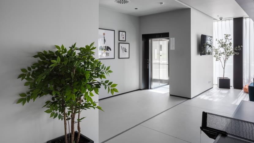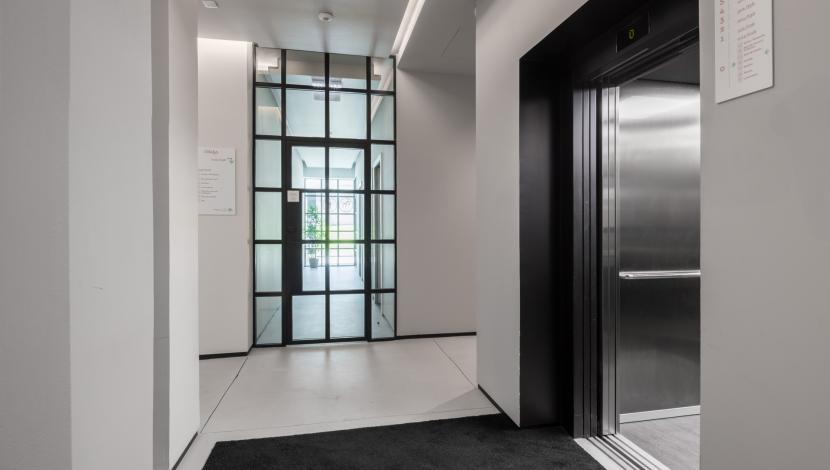 Os elevadores Orona integram-se de forma impecável neste ambiente atual, apostando em cabinas espaçosas, linhas limpas e soluções acessíveis que facilitam a mobilidade dentro do edifício. A transparência do elevador panorâmico, presente num dos pisos, acrescenta um toque de design e uma ligação visual ao exterior, reforçando a sensação de abertura e modernidade do conjunto.